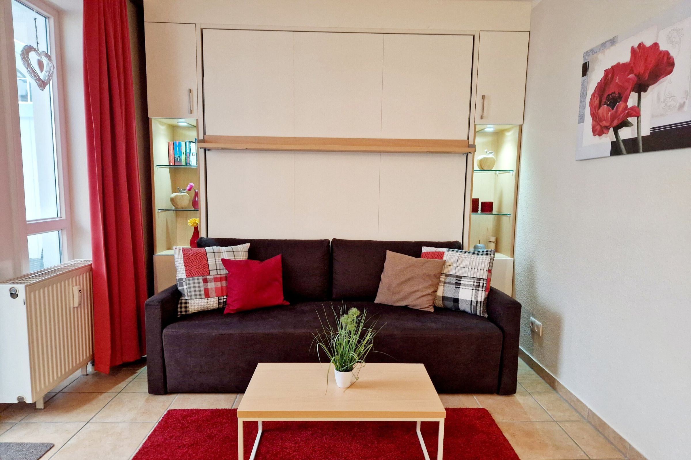 Die Ferienwohnung 631 verfügt ebenfalls über 20,72 m² Wohnfläche und bietet Platz für bis zu zwei Personen. Der kombinierte Wohn- und Schlafbereich ist mit einem praktischen Schrankbett (Doppelbett) und Verdunklungsmöglichkeiten ausgestattet. Auch hier finden Sie ein Badezimmer mit Dusche und WC sowie eine voll ausgestattete Pantryküche mit Mikrowelle, Kaffeemaschine und Toaster. Ein Fernseher sorgt für Unterhaltung. Der Balkon in Südostlage bietet einen idealen Ort zum Ausklingen des Tages.